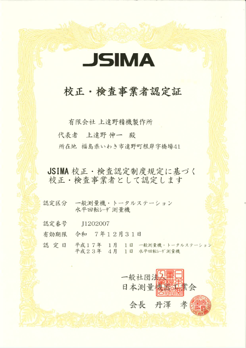●トータルステーション・セオドライト・デジタルレベル・自動レベル・その他 ●許認可番号 【JSIMA事業者認定番号/J1202007】●許認可番号 【JSIMA検査員認定番号/J2202014】 ※JSIMAは、日本測量機器工業会の略称です。